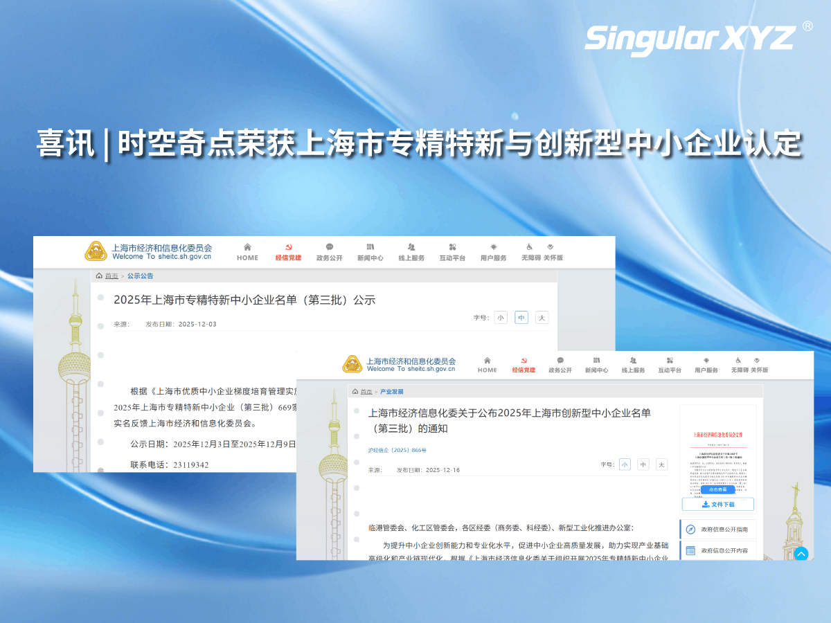 时空奇点荣获上海市专精特新中小企业与创新型中小企业认定