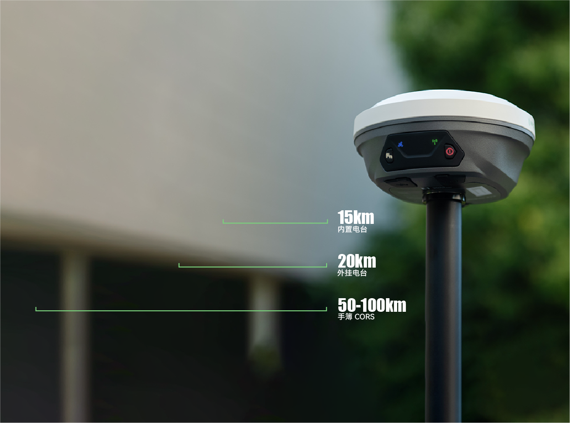 E1 支持标准 RTCM 差分数据格式;在理想环境下,内置超级电台模式可实现最远约 15 公里的作业距离,外接电台模式可至 20 公里;同时设备支持通过蓝牙连接手簿接入 CORS 网络,在网络条件良好的情况下,可实现最高达 50 公里的作业覆盖。
